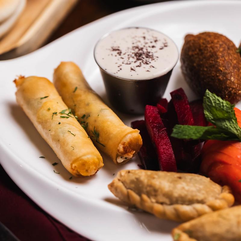 Syrian beef carpaccio, arugula, tomatoes, onions, olive oil, pomegranate molasses, fried almonds