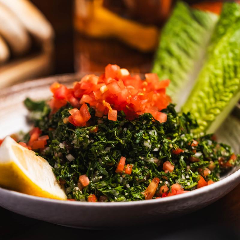Parsley, mint, onions, bulgur, tomatoes, lemon-olive oil