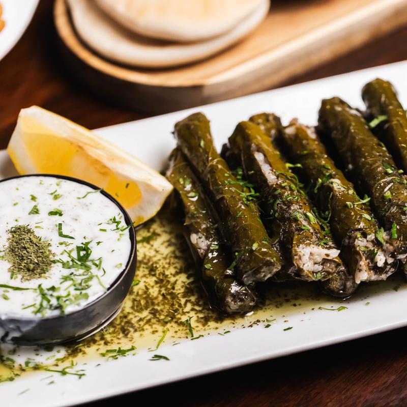 Rolled grape leaves, rice, spiced lamb, garlic, and lemon broth