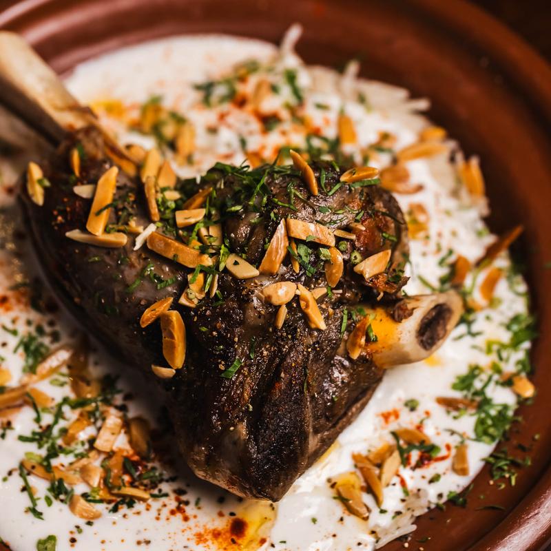 Lamb shank over tahini sauce, mixed yogurt garlic, rice and chopped pita